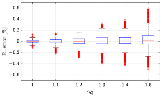 A summary of the error distribution for the CHT estimation using the CBEKF-AU strategy with respect to increasing levels of degradation is proposed in Figure 9 in terms of box plots. The distribution, which is verified to be well approximated by a normal distribution, shows a linear increase in its standard deviation if degradation level increases. Additionally, there is a drift of the mean error for degradation levels greater than . Furthermore, for values greater than 1.3, both the interquartile range and the whiskers grow linearly, suggesting a decrease in consistency and an increase in the spread of the data. This indicates greater variability, particularly in the tails of the distribution. Nevertheless, this is expected, as values higher than 20–30% no longer represent degradation of the system but rather a fault or an entirely different system.