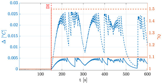 Another relevant outcome of the proposed work is the detection of thermal degradation. Indeed, the CBEKF approach is based on the estimation of model-deviation term , which can also be leveraged as symptom of thermal flow degradation. Figure 10 reports the model-deviation term () for two values of the degradation factor . The degradation symptom responds instantaneously to the degradation injection, and it is characterized by a non-null mean value. It is worth noting that, despite some fluctuations, within the first 50 s after the degradation injection, the time derivative of the model-deviation term is roughly linear with respect to the degradation level. The value of the model-deviation term derivative after 10 s for different combined values of degradation factors and are presented in Figure 11, pointing out that the derivative increases linearly with the severity of the degradation.