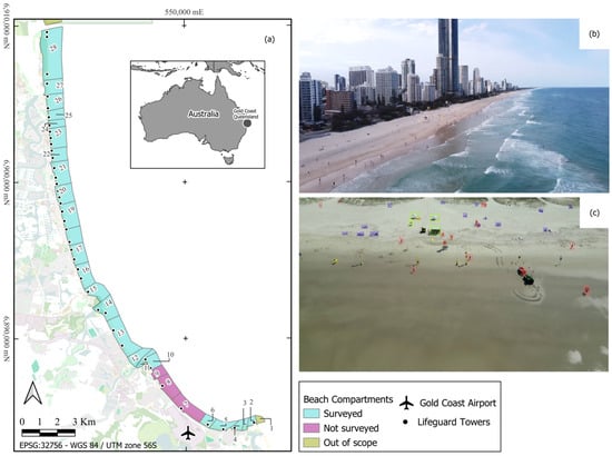 Sandy beaches comprise one third of the global coastline [1] and provide many economic, ecological, and cultural values contributing to human health and well-being [2,3,4]. They can also represent a hazard for visitors due to risk of injury or drowning associated with beach rips, high-energy waves, tides, and other causes [5,6,7,8]. Hence, the management of beaches and associated infrastructure to support ongoing sustainable and safe usage is important for ensuring and fulfilling increasing beach usage demands [9,10,11]. Understanding variability in beach usage patterns is also critical for planning current and future maintenance and infrastructure requirements. In 2021, the collection of human usage data was identified as a top research priority by the coastal geoscience community in Australia [12]. Therefore, obtaining accurate information about the human use of sandy beaches in well-developed urban areas is a key component of beach management [12,13,14].