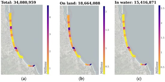 The City of Gold Coast Ocean Beaches Strategy—End of Life Review stated that an increasing population and the consequential changes to the use of beach amenities was one of the significant challenges for managing these natural assets into the future [67]. The work presented here supports a better understanding of these challenges by providing a more accurate tool with which to understand beach visitation and beach usage. Additionally, the City publishes an annual State of the Beaches Report, which aims to provide an overview of Gold Coast beaches and their visitors, uses, and facilities, while demonstrating the City of Gold Coast’s role in coastal management [40]. The State of the Beaches report includes beach visitation counts per compartment, with a breakdown between swimming, surfing, and craft activities. The methodology presented here enhances these management tools by providing more accurate data to support the allocation of funds to beach protection, assets, and amenities.