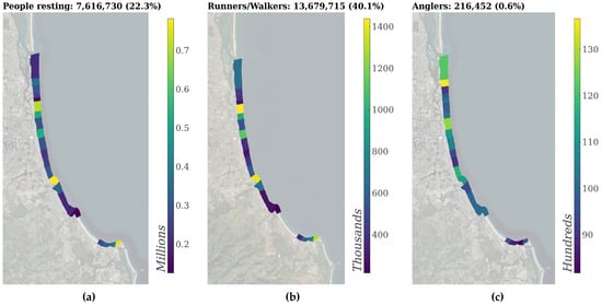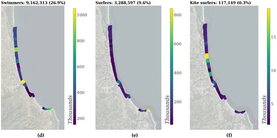 Annual estimate of people per usage category and compartment: (a) people resting; (b) runners/walkers; (c) anglers; (d) swimmers; (e) surfers; and (f) kite surfers. Reported percentages add to 99.8% due to rounding. Satellite layer by ESRI Earthstar Geographics.