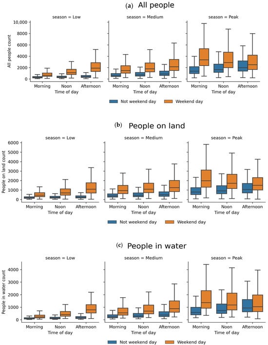 Effect of season, day of week, and time of day on people counts for (a) total counts, (b) people on land, and (c) people in the water. Count estimates derived from Land–Water model and GLM for a typical compartment. Box plots show median values, 25th/75th percentiles, and min–max range.
