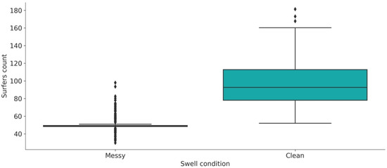 Swell condition effect on surfer count. Surfer estimate derived from Usage model and GLM for a typical compartment. The clean condition refers to smooth, well-formed, and consistent waves, while the messy condition refers to choppy and irregular waves.
