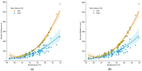 Relationship between rain chance and temperature on people resting count (a) and runners/walkers count (b). Estimates derived from Usage model and GLM for a typical compartment.