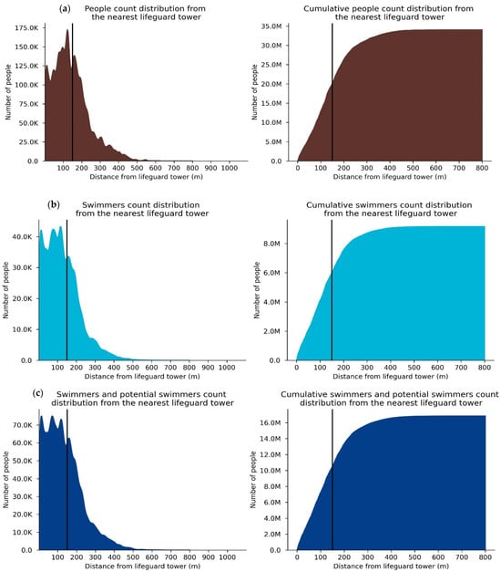 Spatial distribution of people with respect of lifeguard towers: (a) all people; (b) swimmers; and (c) swimmers and potential swimmers (i.e., people resting). Derived from the annual estimated total user counts, the kernel density estimate used a Gaussian kernel for smoothing people counts over the observed distances (left). KDE allows us to identify the distance with greater mass distribution, i.e., at which distance from a tower people are more concentrated. The cumulative KDE produces an empirical cumulative distribution so that the height of the filled curve reflects the estimated number of people at a specific distance (right). A vertical line at 150 m from the tower is included as a reference.