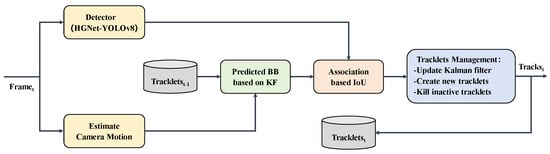 The workflow of BoT-SORT is illustrated in Figure 3. It contains three stages: detection, tracking, and track management. During the detection stage, the YOLOv8 is employed to identify objects within video frames. In the tracking stage, an enhanced Kalman filter is utilized to construct the motion model of the targets, thereby facilitating the prediction of their positions in subsequent frames. Traditionally, most tracking methods, such as those employed in Deep SORT [39], utilize a seven-element state vector (Equation (4)) that includes the bounding box’s center coordinates , area (s), and aspect ratio (r).