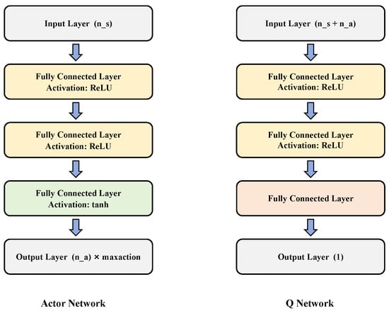 In the TD3, both the actor network and the two Q networks employ fully connected feedforward neural network architectures, as illustrated in Figure 5. The actor network takes a state s with dimension (state dimension) as input. This input is processed through two hidden layers (each comprising neurons (hidden layer width) with ReLU activation functions). The network concludes with an output layer that utilizes a tanh activation function to generate an action a of dimension . The output action is then scaled by a maximum action coefficient to produce the final action output. The Q networks receive a concatenated input comprising the state s and action a, which is processed through two hidden layers, each containing neurons and utilizing the ReLU activation function. This processing culminates in an output layer without activation functions, which directly provides the Q-value. The weight initialization for all networks follows a uniform distribution.