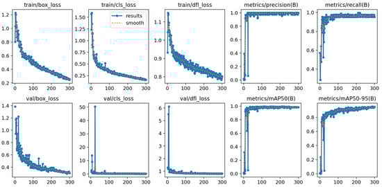 Figure 8 depicts the training results of YOLOv8. It is evident that an increase in the number of training epochs correlates with a marked enhancement in the model’s performance on both the training and validation datasets. Notably, the three primary loss functions demonstrate a consistent decline, while evaluation metrics (precision, recall, , and ) exhibit progressive improvement throughout the training process.