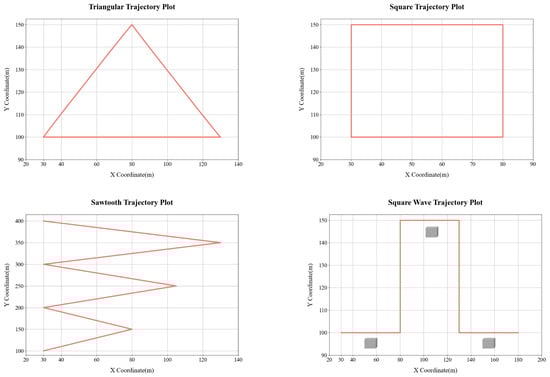 - This metric quantifies the mean absolute deviation of the drone’s actual flight altitude from the initial set altitude of 4 m. Despite the lack of direct altitude control in the experiment, variations in altitude still arise due to the inherent dynamics of the quadrotor drone during planar motion execution. A smaller Zdif value indicates higher precision and the superior dynamic compensation capability of the controller during complex planar maneuvers. The formula is as follows: