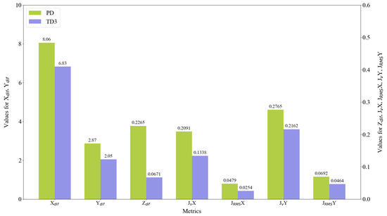 The experimental results for the different scenarios are presented in Figure 13, Figure 14, Figure 15 and Figure 16. In these figures, the blue curves represent the TD3 controller, and the green curves represent the PD controller. The left Y-axis corresponds to and , while the right Y-axis corresponds to , , and . The units for , , and are meters (m), is in meters per second (m/s), and is in meters per second cubed (m/s3).