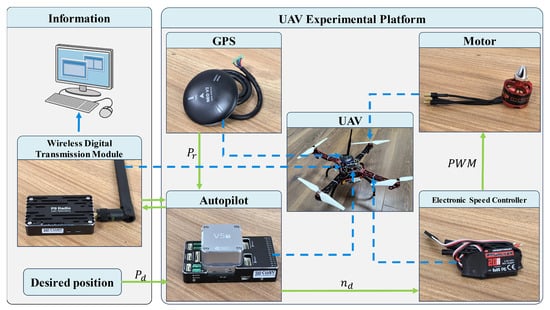 The PID trajectory tracking control scheme is a classical dual-loop structure composed of an outer position loop and an inner attitude loop. The outer loop corrects the UAV’s position by minimizing the error between the desired trajectory and the current UAV position, while the inner loop stabilizes the UAV’s attitude based on position error feedback. The error-based control method enables precise adjustments to the UAV’s motion and attitude, allowing for reliable tracking of a given path. This ensures robust trajectory tracking, even under disturbances such as wind.