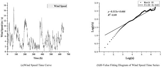 In [50], the results of fractal analysis show that both daily and hourly mean wind speeds exhibit clear time series fractal behavior and the fractal dimension does not vary with time scale. Self-similarity is one of the important features of fractals, and when an object has self-similarity, then its fractal can be considered to have scale-invariance under geometric transformation, i.e., similarity or statistical self-similarity between time series under different time scales such as daily, weekly, and monthly [51]. Wind is a natural motion formed by the flow of air with apparent chaotic characteristics, and the wind speed time series exhibits obvious self-similarity. Therefore, the analysis of wind speed mapping based on wind speed time series data can be conducted using fractal analysis. The Hurst index is used to quantify the degree of fractal self-similarity in the time series and the persistence of the underlying stochastic process. Different Hurst indices correspond to different characteristics of the time series [52].