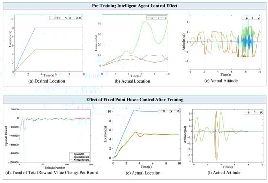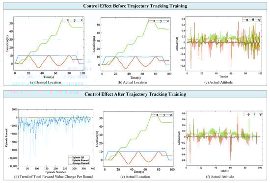 In the early stage of training, the UAV’s ability to hover at a fixed height without wind disturbance is developed. The maximum allowable altitude error is set to 2 m, with rewards earned when the altitude error is less than 1 m and the rate of change in altitude error is less than 3 m per second. Subsequently, the complete wind field perturbation model is introduced to train fixed-height hovering and the maximum allowable error is reduced to 1 m; rewards are obtained when the error is confirmed to be less than 0.1 m, the rate of change in the error is less than 0, and the number of the initial training sets is set to be 2000. Finally, the UAV uses the agents obtained from the previous stage of training to conduct the training of trajectory tracking, and the training task is set to resist the wind perturbation and track the desired position, and the maximum allowable error is set to be 0.1 m. The single-step reward is set as follows: