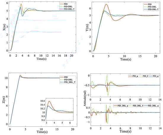Notably, the effectiveness of the trained PID_DRL_T controller highlights the critical role of training in enhancing control effectiveness and stability. While the wind resistance capabilities of UAVs are commonly assessed through induced velocity and propeller thrust metrics [19], the proposed method goes further by incorporating learning-based adaptive control strategies that effectively handle both horizontal and gusty winds. The innovative approach not only offers a new solution for UAVs facing wind disturbances but also significantly improves operational efficiency in real-world scenarios, ultimately enhancing the UAV’s stability against wind disturbances through continuous adaptation of the agent model and control strategy.