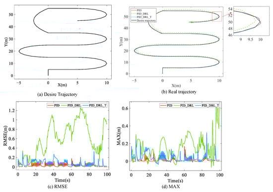 Concerning the maximum error (Max), the maximum error of PID_DRL_T is reduced by approximately 36% compared to PID, decreasing from 0.44 m to 0.28 m. In comparison to the untrained PID_DRL controller, the maximum error of PID_DRL_T is reduced by about 65%, decreasing from 0.8 m to 0.28 m.