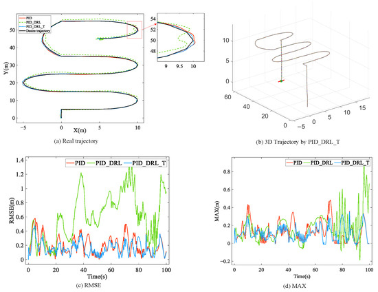 Specifically, the PID controller presents a significant advantage in achieving the desired trajectory. In terms of RMSE values, the PID and PID_DRL_T controllers show similar trends and have a maximum value of about 0.2, respectively, whereas the maximum value of the PID controller is smaller than that of the PID_DRL_T controller, and both are significantly smaller than that of the untrained PID_DRL controller, which fluctuates with a mean value of about 0.6 and a peak value of more than 1.2.