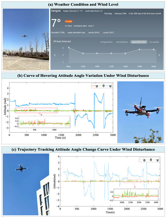Figure 12 shows the experimental circumstances and the outcomes of the aerial test conducted on the specified day. The experimental platform transitions into the wind-resistant and stabilization flight mode immediately after lift-off and conducts hovering (b) and trajectory tracking tests (c) under the depicted weather and wind conditions (a). In this mode, the reinforcement learning compensator contributes to control. As depicted in the curves of (b), the UAV achieves precise hovering at the specified position with an attitude angle change of less than 0.3 rad using the proposed control algorithm. Furthermore, in the trajectory tracking test, the UAV demonstrates excellent performance, with the maximum attitude angle change not exceeding 0.27 rad, along with minimal fluctuations and jumps. These are primarily attributed to the control algorithm’s resistance to external wind perturbations, showcasing the UAV’s robustness and adaptability in this flight mode. Through these flight tests, the control algorithm’s exceptional performance in trajectory tracking and hovering, along with its strong adaptability, is validated on the real platform.