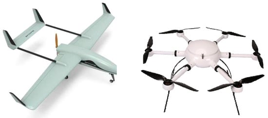 An ideal UAV should demonstrate exceptional performance in terms of long-range endurance, operational flexibility, cost-effective maintenance, and low pollution emissions. The configuration of the UAV is one of the key factors that significantly impact its overall performance [6]. Based on aerodynamic shape, typical UAVs can be classified into fixed-wing and multi-rotor configurations as depicted in Figure 1. Among these options, the fixed-wing configuration is widely equipped for high-speed flights and heavy payload requirements [7]. In comparison to other configurations, the multi-rotor design offers advantages such as convenient deployment and flexible maneuverability [8].