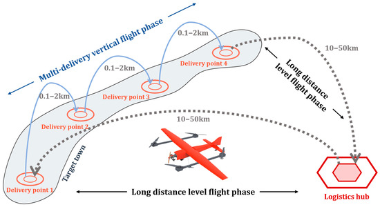 The flight profile is another factor that can impact the performance of UAVs. The settings of the flight profile primarily depend on the application environment and mission objectives of the UAV [9]. One typical flight profile for UAVs is multi-point goods delivery or device inspection, as depicted in Figure 2. To successfully accomplish missions like these, it is essential for UAVs to possess high-speed capabilities during level flight modes and exceptional maneuverability during vertical flight modes.