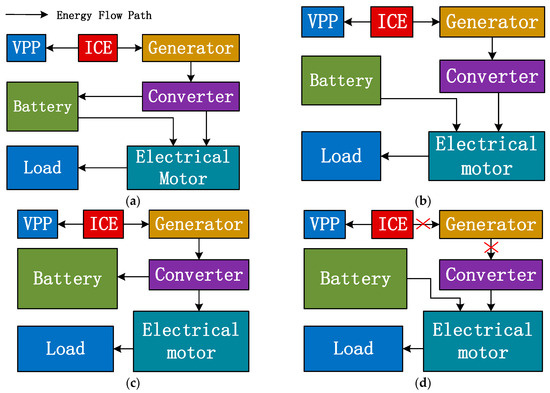 The improved series hybrid architecture and three different energy paths of the hybrid power system under different thrust modes. (a) The diagram illustrates the bidirectional flow path of energy throughout the hybrid system; (b) energy flow path in the full thrust mode, illustrates that in the case of vertical lift; (c) illustrates the energy flow path in cruise mode, in which the UAV is airborne; (d) energy flow path in the emergency thrust mode, shows the emergency mode.