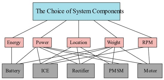 Energy and weight being two conflicting battery choices, this paper chooses a 1.5 kg Li-Po battery, which can provide 5.76 kW of energy at the same time. While the ICE meets the thrust feasible condition of maximum RPM, the location of the ICE should also be considered, either at the nose or tail of the aircraft. In view of its vibration, heat dissipation and ease of disassembly, the nose of the aircraft is the location of choice for this work. For PMSM, the main consideration is its power generation, this paper chooses 2 kW PMSM. The rest of the components are shown in the above figure after the combination of factors to make the appropriate choice.