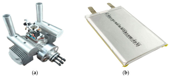 (a) Piston ICE that drives a propeller in the cruise mode to provide the forward thrust for the aircraft. It also drives the PMSM to generate AC, which is passed through a rectifier to charge the batteries used in the drogue phase; (b) the Li-Po battery used in drones is designed as a single unit, usually a single unit with a voltage of 3.8 V to 4.2 V. The power system battery is made up of 12 pieces connected in parallel to ensure that the dropping voltage reaches 48 V and above.