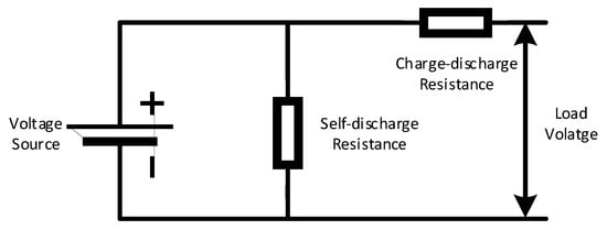 The Li-Po battery, as mentioned earlier, undergoes self-discharge even when not in use. Therefore, a self-discharge resistance is connected to both terminals of the voltage source. Its resistance can be determined using the following Equations (9) and (10).