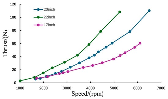 The thrust performance of the 17-inch, 20-inch, and 22-inch propellers.
