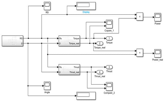 The performance of the VPP is significantly more intricate when compared to lift rotors. Due to the distinct working environment, the relationship between the power requirement and thrust output of the VPP cannot be simply described as linear. In the simulation of the VPP, there are two subsystems that calculate torque and thrust based on input signals such as rotational speed and pitch angle as depicted in Figure 13. In the two subsystems, in accordance with the blade-element theory, the propeller blade can be subdivided into discrete segments, and the force exerted on each segment can be analyzed. The tension and torque generated by the entire propeller can then be derived by integration. Nevertheless, the associated formulas are more intricate, necessitating the simplification of these formulas. This is due to the fact that the ratio of the blade vein chord length to the distance from the hub and the lift coefficient of the pitch propeller in the pitch propeller formulas are fixed values, while the air density remains an invariant constant within a certain range. Following numerous iterations of ground test data and the coefficient method, along with extensive verification, the simplified formula coefficients were approximated. It can be concluded that the thrust (T) and torque (M) are functions of the pitch angle and the number of revolutions of the paddle.