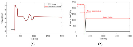 (a): Simulation thrust from VPP compared with demanded thrust; (b): simulation electric load that represents the lift on rotor.