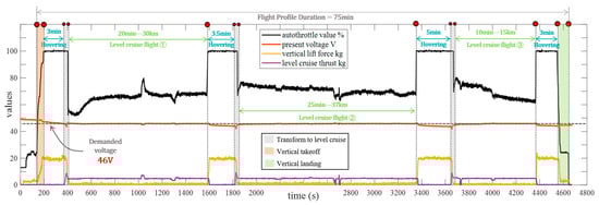 The endurance time and stability are two crucial standard test parameters in the performance experiment. The length of hovering endurance time, which serves as a fundamental indicator to validate the performance of the hybrid power system in the compound-wing VTOL, should be conducted initially. In hybrid compound-wing VTOLs equipped with a hybrid power system, the power requirement during hovering mode is typically higher than other modes. Therefore, conducting a hovering endurance experiment can also assess stability under heavy-load conditions. Some environmental parameters and settings for the hovering experiment are presented in Table 5, while Figure 18 illustrates the experimental setup. The data obtained from the ground test is displayed in Figure 19. As shown in Figure 19, three consecutive hover-to-level flight tests were successfully completed, and the total hover time was close to 15 min. When hovering, the system performs sub-optimally due to the need to counteract gravity, insufficient voltage (below 46 V) and maximum power output from the internal combustion engine. During level flight, the battery voltage serves as a reference point for adjusting the engine’s power output (as indicated by the autothrottle value percentage in the graph). After successfully transitioning to level flight for the first time, there is a sharp increase in autothrottle value accompanied by a drop-in system voltage below 46 V. Additionally, there is a peak in horizontal cruise thrust. In subsequent level flights, as battery charge exceeds 46 V, there is a gradual decrease in autothrottle value for the entire internal combustion engine along with an increase in level flight speed. These findings validate the feasibility of the hybrid power system.
