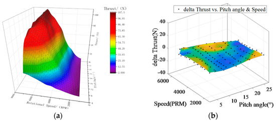 (a) The output thrust character of the VPP (ground experiment); (b) difference between measured data from the ground experiment and numerically simulated values.