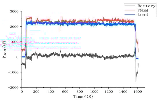 These experimental findings are visualized in Figure 23. The provided figure depicts the power relationship among the motor, battery, and selected PMSM during the hovering test flight conducted in this paper. In the hybrid system, the power generated by the permanent magnet synchronous motor and the charging/discharging power of the battery are approximately equal to the load power of the motor. Throughout the hovering period, a constant level of load power is maintained for the motor. Whenever there is a need for battery-powered supply or charging within the system, it leads to a corresponding decrease or increase in power generated by the permanent magnet synchronous motor. This entire process has been demonstrated to last over 25 min, thereby confirming that this series hybrid system can fulfill multiple take-offs and landings as per target requirements. Moreover, this substantiates its applicability to this 25 kg compound-wing VTOL.