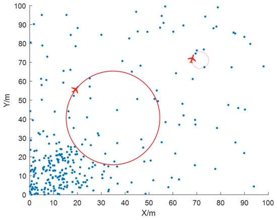 Figure 2 illustrates the coordinate distribution of the incoming swarm with the blue dots (in a two-dimensional scenario), while the red circles depict the scale of the turning radius for our anti-swarm UAVs. The larger red circle represents the correct scale, and the smaller, semi-transparent circle indicates an incorrect scale. Given the spacing relative to the incoming swarm, the anti-swarm UAVs focus on “stabs”; hence, the minimum turning radius is relatively large. If there is no turning radius limit, the problem will resemble the Traveling Salesman Problem.