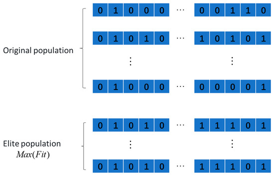 where Cons represents the constraint on the curvature radius, and if it meets the constraint, it is set to 1; otherwise, it is set to 0. represents the number of strike points, and it is desired to have as many as possible while meeting the constraints. Therefore, we need to process the population further. As shown in the first row of Figure 4, the population requires a random distribution of fewer individuals, as having too many is likely to make it difficult to meet the constraint of the turning radius, and the iterative convergence process should proceed from few to many, rather than from many to few. Secondly, as shown in the second row of Figure 4, there are a large number of completely random 0–1 sequences to increase the diversity of the population. Finally, as shown in the third row of Figure 4, we also need to force the number of solutions to be no less than 2, because a straight line always meets the curvature condition. To further solve the problem of sparse solutions converging slowly, an elite strategy is introduced. As shown in Figure 4, in each iteration, the population with the is replicated in proportion to the initial population to prevent the optimization process from diverging. This method can effectively solve the problem of sparse solutions being difficult to converge.