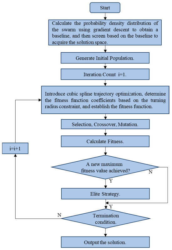The overall framework of the improved genetic algorithm is depicted in Figure 5. We first significantly reduce the solution space through the calculation of the baseline, then generate the initial population based on the principles shown in Figure 4, and proceed into the iterative process. For each iteration, possible combinations are interpolated using piecewise cubic spline interpolation, and the spline curves are optimized. The constraints of the turning radius are then checked to determine the value of the fitness function. Following this, the selection, crossover, and mutation stages are performed. Finally, an elite strategy is employed to forcefully retain the population with the highest fitness, and the process enters the next iteration until the specified number of iterations is reached.