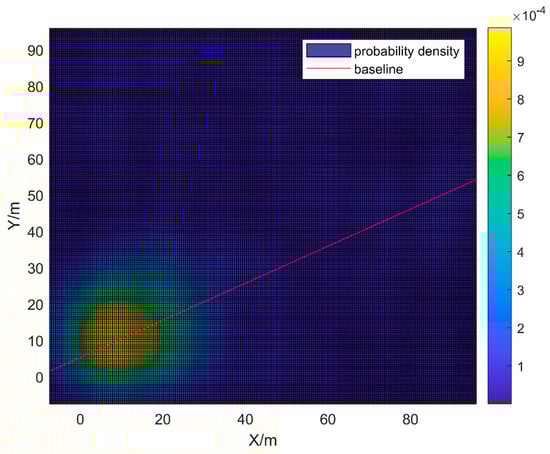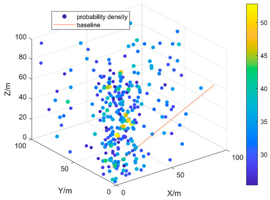 For a plane line, the variables to be optimized are the coefficients [a, b], while for a space line, there are six variables to be optimized, specifically, [x0, y0, z0] and [l, m, n]. The remaining process is similar to the two-dimensional procedure, and the final solution obtained is [x0, y0, z0] = [3.34, 6.18, 15.85] m and [l, m, n] = [51.45, 4.47, 22.65]. The spatial density distribution and the baseline are shown in Figure 8.