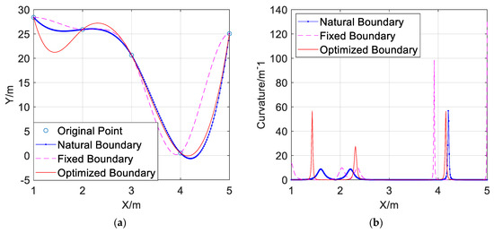 In the formula, . Equations (9)–(11) are the continuity conditions that the cubic spline function must satisfy. is an interpolation polynomial of degree no greater than three in each subinterval, so there are four unknown parameters in each subinterval. The number of subintervals is n, which means the total number of unknown parameters is 4n. From Formulas (8) to (11), it can be seen that the interpolation conditions and spline conditions provide only 4n − 2 conditions. Therefore, it is necessary to add two known conditions to solve for the unknown parameters. Usually, the known conditions are increased by imposing endpoint constraints, which are the boundary conditions. Commonly used boundary conditions include natural boundaries, fixed boundaries, and clamped boundaries, among others, or custom boundaries can be defined to adjust the curve. In this problem, we need to find a set of boundary conditions such that the maximum curvature of the spline curve over all the intervals is minimized.