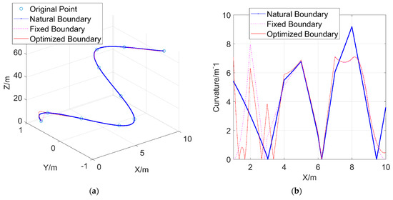 Wherein t and T are the tangent vector and acceleration vector of the curve, respectively. denotes the vector cross product, and represents the magnitude of a vector. In Equation (16), and are the two-dimensional planar expressions, which can be controlled by the states of the starting and ending points. After the transformation by Equations (14)–(17), the spatial curve can be controlled by two sets of starting and ending points, i.e., four parameters . By substituting the parameters into Equation (16) and then using Equation (17), the curvature of the spatial curve can be calculated. By adopting an optimization method similar to the two-dimensional process, an optimized spatial piecewise cubic spline interpolation curve can be obtained, with the minimum maximum curvature in space. Given a set of random points, the curve with optimized boundary conditions is compared with two conventional boundary condition curves, along with the comparison of their curvatures, as shown in Figure 11. This result can be used to determine whether the turning radius meets the constraints in the optimization process of three-dimensional trajectory problems.