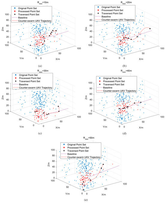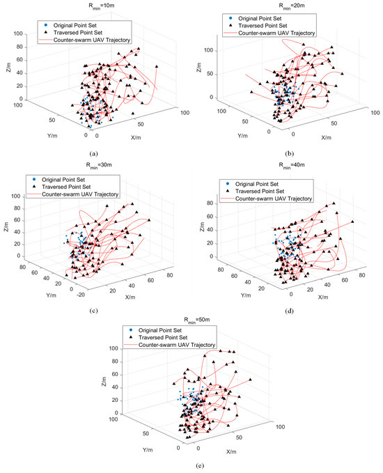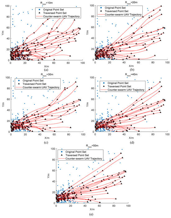 The strike situations of a single anti-swarm drone under different minimum turning radius constraints: (a) The strike results of a single anti-swarm drone with Rmin = 10 m. (b) The strike results of a single anti-swarm drone with Rmin = 20 m. (c) The strike results of a single anti-swarm drone with Rmin = 30 m. (d) The strike results of a single anti-swarm drone with Rmin = 40 m. (e) The strike results of a single anti-swarm drone with Rmin = 50 m.