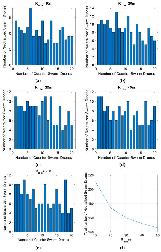 The number of strikes by individual anti-swarm drone with a total of 20 anti-swarm drones under different Rmin constraints: (a) The number with Rmin = 10 m. (b) The number with Rmin = 20 m. (c) The number with Rmin = 30 m. (d) The number with Rmin = 40 m. (e) The number with Rmin = 50 m. (f) Relationship between total number and Rmin.
