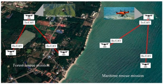 Unmanned aerial vehicles (UAVs), commonly known as drones, have gained significant attention in recent years due to their versatility and potential in a wide range of applications [1]. Among the most impactful areas of UAV deployment are rescue maritime operations and forest rescue operations [2,3], where UAV-enabled wireless communication plays a critical role [4]. In both fields, the ability to provide real-time data transmission, communication, and monitoring is essential for operational efficiency, safety, and decision-making.