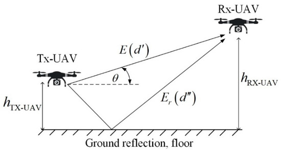 Note that two propagation waves arrive at the Rx-UAV such as the direct wave that is a distance ; and the reflected wave that is a distance . Thus, is the separation distance between Tx-UAV and Rx-UAV. The -field in LOS at the Rx-UAV is given as