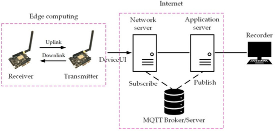 Figure 3 illustrates the LoRa communication network, comprising three key sections: edge computing or the LoRa module (between the transmitter and receiver), the Internet or cloud network, and the recorder or web applications. At the edge computing level, the LoRa transmitter sends downlink data to the LoRa receiver. The uplink channel then facilitates communication from sensors or actuators to the Internet when the network server processes the device user interface (DeviceUI) is processed by the network server. Within the Internet, the Message Queue Telemetry Transport (MQTT) protocol subscribed DeviceUI to the network server and published data to the application server, enabling real-time monitoring of data from the edge computing layer.