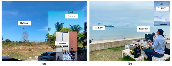 The field measurement test was conducted at KMITL Prince of Chumphon Campus, Thailand. In the FF1 and FF2 scenarios, the Tx-UAV was positioned at a fixed altitude of 5 m at coordinates 10.726136, 99.375188, and for the FF2 scenario, it was located at 10.721133, 99.385508. The Rx-UAV was tested at varying altitudes ranging from 1 m to 20 m, with coordinates of 10.730588, 99.381898 for the FF1 scenario, and 10.719542, 99.393762 for the FF2 scenario. The parameters for the measurement setup are outlined in Table 1, and Figure 6 illustrates the field test setups for both FF1 and FF2 scenarios.