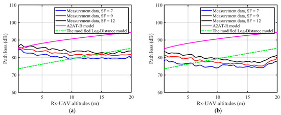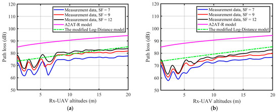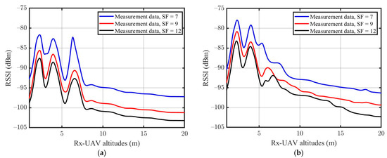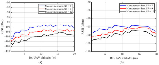The RSSI in the FF1 (forest floor) scenario is shown in Figure 7a,b. Figure 7a illustrates the RSSI (dBm) versus Rx-UAV altitudes, ranging from 1 m to 20 m. The blue line represents measurement data for SF = 7, with RSSI values ranging from −104.63 dBm to −100.50 dBm. The red line shows SF = 9, where RSSI ranged from −106.21 dBm to −101.50 dBm, and the black line represents SF = 12, with values from −106.41 dBm to −103.50 dBm. A notable drop in RSSI was observed as the SF increased from 9 to 12, with a reduction of approximately 4.2 dBm. The phenomenon observed in Figure 7a,b, where the RSSI increases between 1 m and 15 m, and then decreases beyond 15 m, can be explained by the effects of forest shadowing and separation distances. At altitudes between 1 m and 15 m, the Rx-UAV is initially within the forest shadowing zone, where signal attenuation is higher due to obstructions from trees and vegetation. As the Rx-UAV rises above this shadowing zone (between 1 m and 5 m), the signal experiences less attenuation, leading to an increase in RSSI. Between 5 m and 15 m, the signal encounters fewer obstacles, resulting in higher RSSI values.