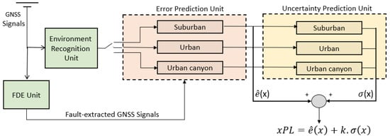 No matter how well the NGB algorithm performs, the success of the NGB-PL approach depends on correctly training the error models with sufficient data. Suppose that the algorithm is trained with generic data regardless of the environment. In that case, the error model is expected to provide large uncertainties for error predictions, resulting in very conservative PL estimations. For this reason, an environment recognition unit should be integrated into the framework to benefit from environment-specific error models. The proposed integrity monitoring framework is illustrated in Figure 1.