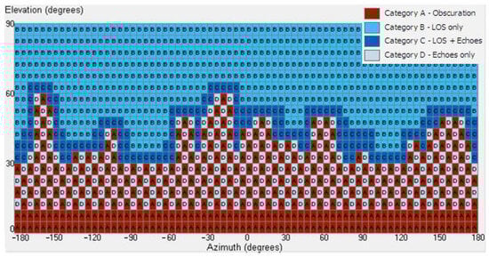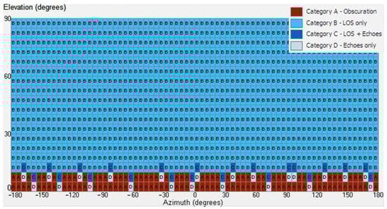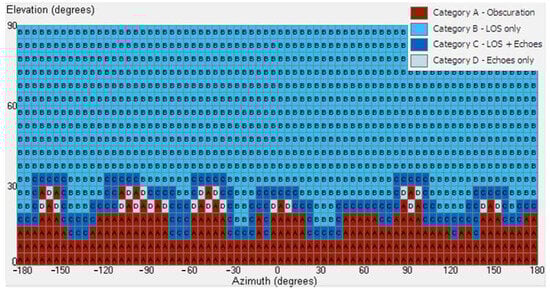 Having discussed the methodology, we will initially explain the details of the simulation strategy, including the environment models and scenarios built in order to generate data to train the environment-specific error models properly. Training data were generated separately for the three urban environment types (suburban, urban, and urban canyon), which were simulated using SimGen software. These environment types are defined based on the assumptions in Section 2.2. Their signal blockage and reflection characteristics are illustrated in Figure 3, Figure 4 and Figure 5 with respect to the elevation and azimuth angles of satellites.