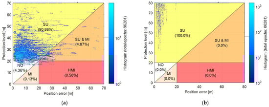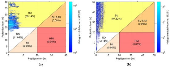 According to the test results, one of the key outcomes of the tests is that the NGB-PL approach enhances the GNSS availability by increasing the NO rates for each environment type in both the horizontal and vertical axes. This is, in fact, because of narrowing the average BG. However, narrower bound gaps can cause additional integrity risks due to a rising MI rate. This situation could be observed in the urban canyon scenario where the classical approach provided a narrower average BG, but the MI rate reached 4.75% for the horizontal axis and 10.61% for the vertical axis. Additionally, despite the increased risks, no increase in availability could be observed with the classical approach in the urban canyon scenario.