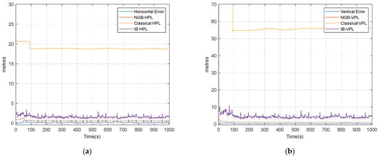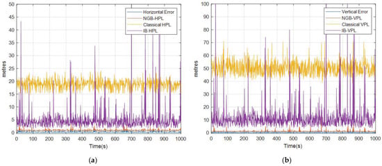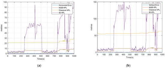 In the urban environment scenario, the NGB-PL approach was significantly more efficient than the other methods, simultaneously providing a balanced performance with a narrower bound gap and higher availability. The GNSS became approximately 90% more available with the NGB-PL approach. Additionally, no integrity risk was observed, neither in the horizontal nor vertical positioning. Unlike the suburban scenario, the IBPL approach is fragile against faulty measurements in urban environments and reacts dramatically to even minimal position error changes, as seen in Figure 18. Although the classical approach provides lower bound gaps than IBPL, IBPLs are still more compatible with UAM integrity requirements to maintain availability and avoid MI.